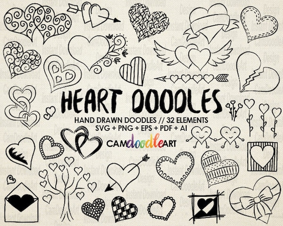 32 Doodle Hearts Vector Pack Hand Drawn Doodle Clipart Hand Etsy