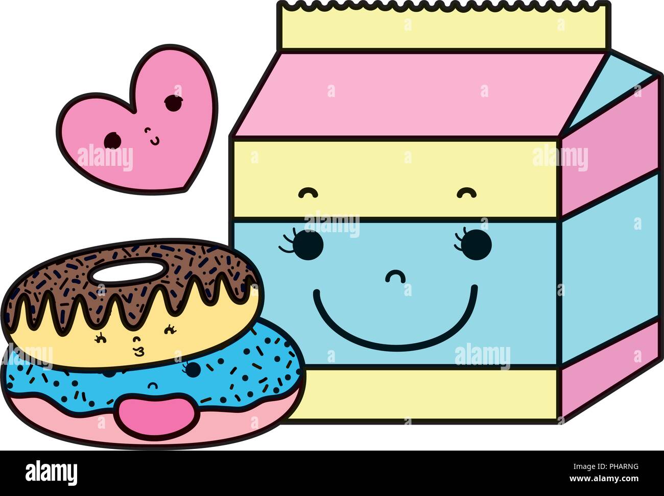 Color Kawaii Donuts With Milk Box And Heart Vector Illustration