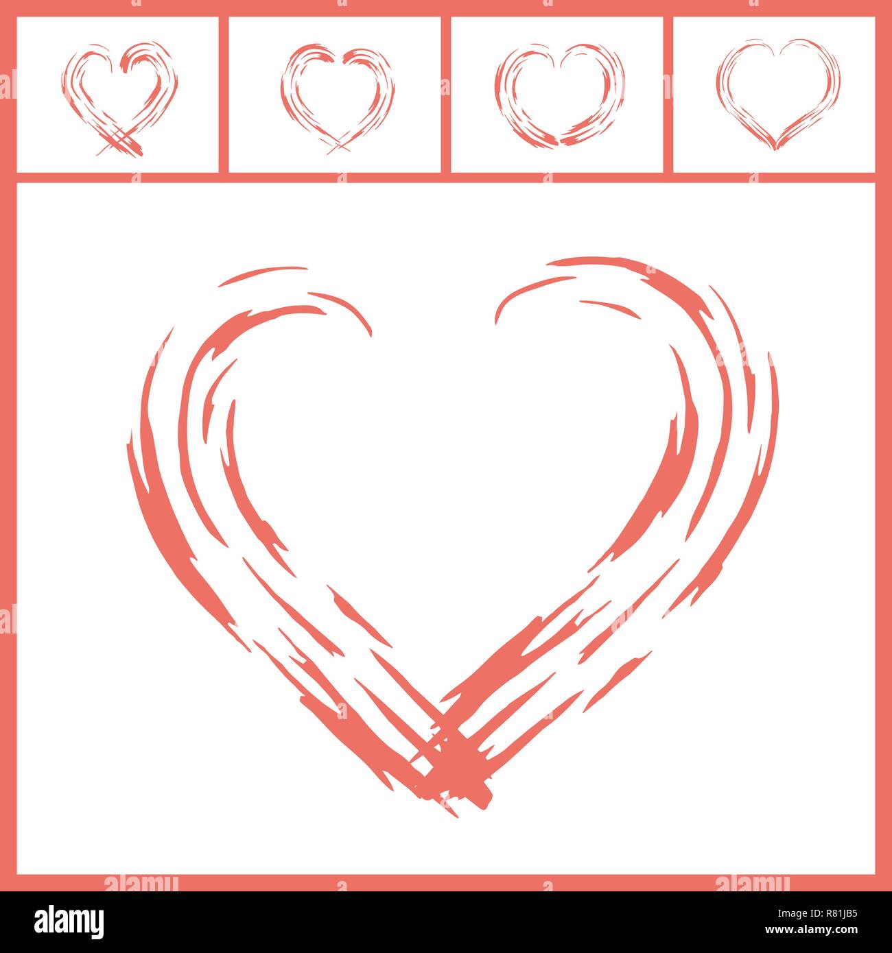 Abstract Paint Brush Pattern Of Five Vector Hearts In Living Coral