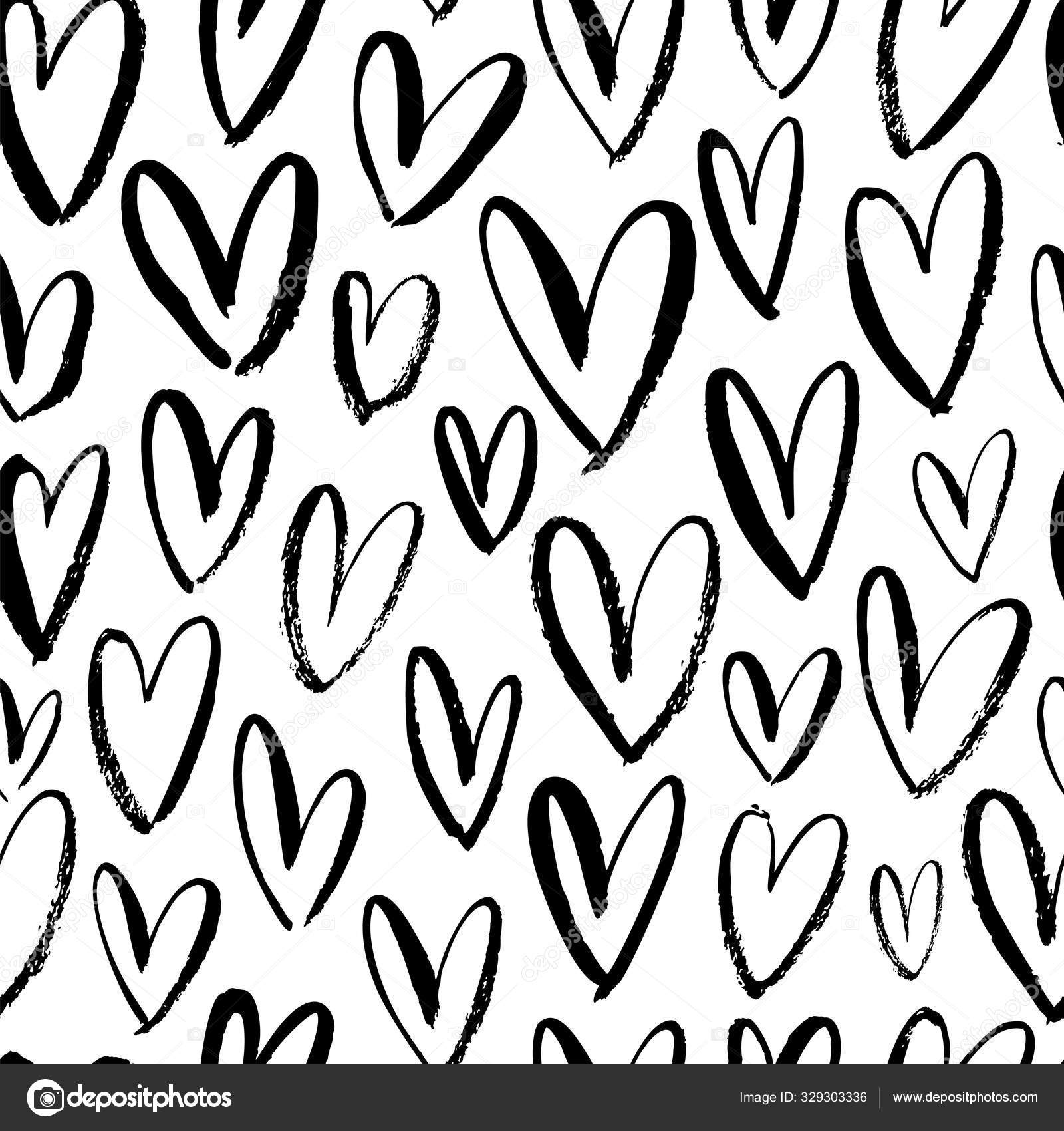 Heart Seamless Pattern Black And White Ink Brush Hearts Hand