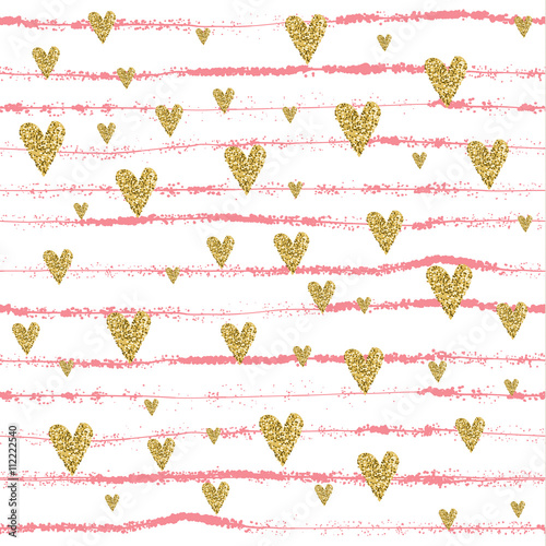 Vector Gold Glittering Heart Confetti Seamless Pattern On Striped