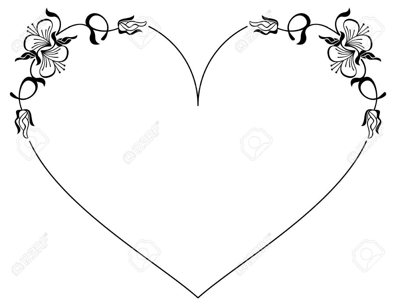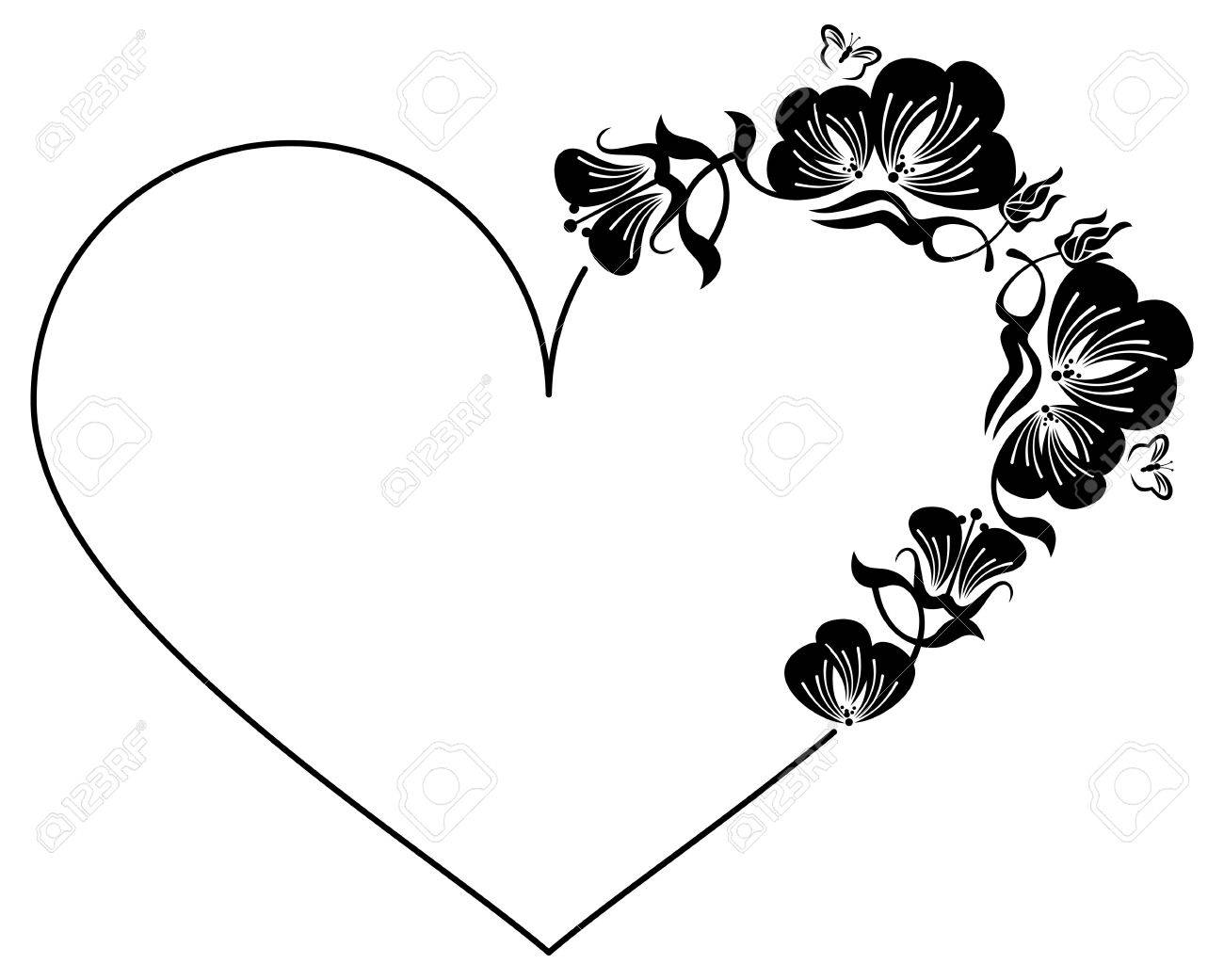 Heart Shaped Silhouette Frame With Decorative Flowers Vector Clip